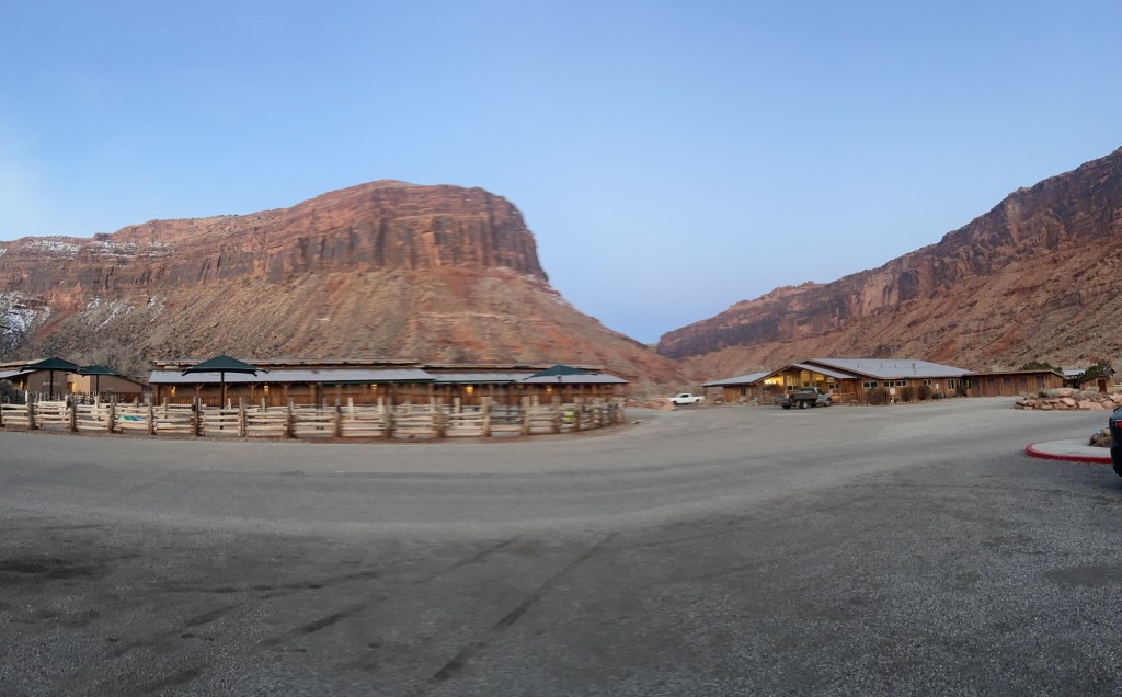 The sun rose on our red rock canyon-surrounded lodge and I walked to a 7am Yoga Class. While I was envisioning an energizing flow with some other lodgers backdropped with a view of the morning over the Colorado River, the reality was me and the instructor, Bri, in the basementβs John Wayne room surrounded by old Western stills. Bri asked how I was feeling and if there was anything I was hoping to accomplish – I said that Iβve been skiing and driving a whole bunch so something stretchier would be nice! She led an awesome class focused on gratitude and our hip flexors – I came out of it smiling and ready for the seven hour drive to Taos.