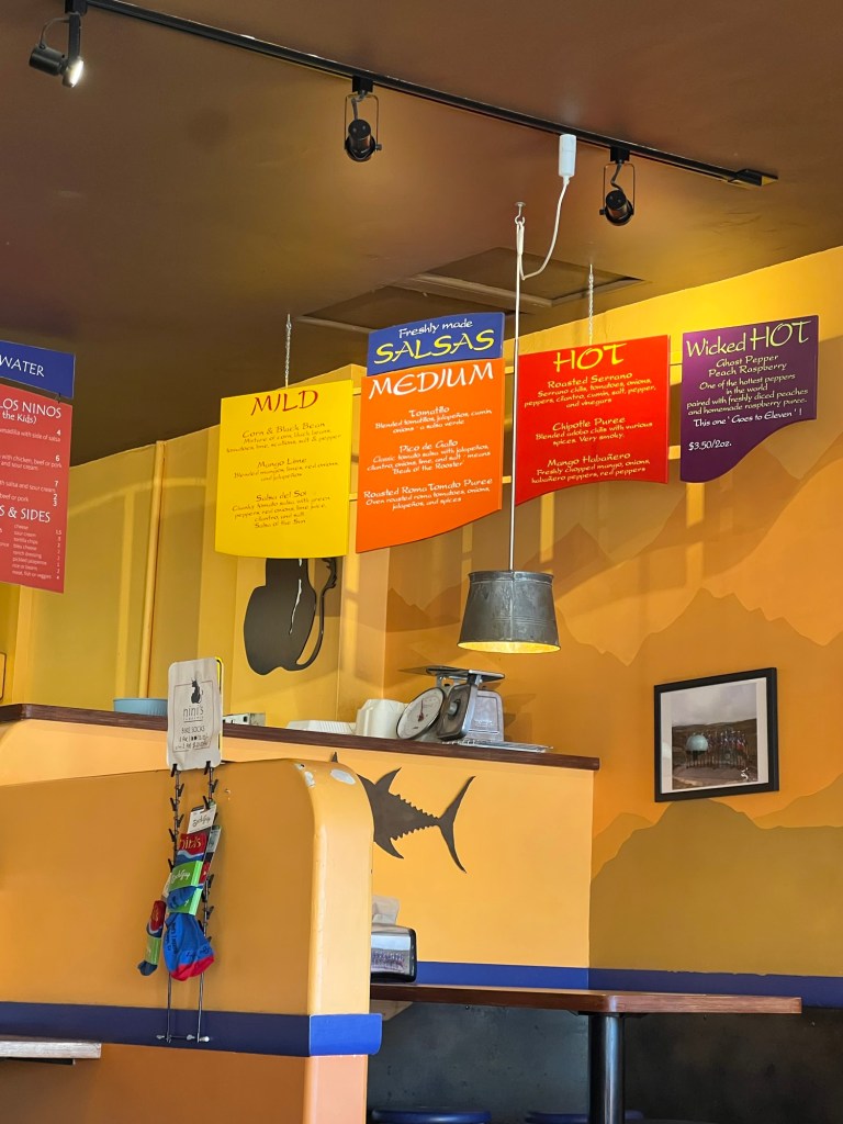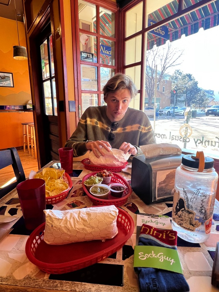 We stopped in Durango, Colorado for some fuel, both for the car and ourselves. We ate carnitas burritos at Niniβs Taqueria while admiring their ten different homemade hot sauces (customers can spin a hot sauce wheel if they are paralyzed with all the options). I went for Mango Habanero and ended up buying a 16oz tub to bring down to Taos, along with a pair of Niniβs Taqueria biking socksβ¦.Durango is apparently world renown for its gravel biking; they host the Iron Horse event, which challenges participants to race a steam engine over two mountain passes into Silverton (the race started as a bet between two brothers over a candy bar). We left super satisfied and ready for the final four hour stretch.