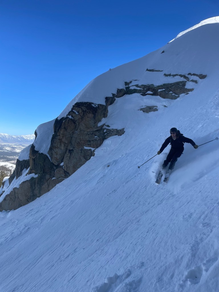 On top of the beautiful, granite ridge Mike showed us Plans A, B, and C. “Generally you want a B and C that don’t actually suck! Or else you won’t want to ski them and might make bad choices.” Plan A was an open, steel bowl with a few “S” tracks running down it from some earlier attendees. Plan B was an interesting looking chute, which despite being North Easterly and leeward (where the wind should be depositing) facing according to the forecast, looked slightly wind scoured – ripples, textured snow, and hard packed drop ins. Apparently despite the expected wind forecast,the channel created between Mammoth Peak and the Crest we were on creates a funnel for wind, slightly altering its direction. Plan C was the Hollywood Chute – true to its name it was a steep and badass looking run but had the potential for unsafe conditions or bad snow. Standing above it, it did look like what Nick and I were hoping for. We went through an evaluation and despite the low expectations we were told to maintain (preventing potential disappointment), the conditions looked pretty good. Maybe not as good of skiing as Plan A, but this kind of run was why we hired a guide!